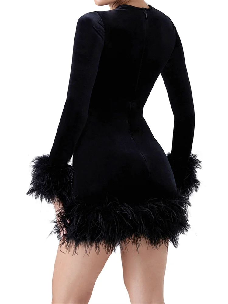 Women Bodycon Dress, Long Sleeve Crew Neck Feather Patchwork Slim Fit Mini Dress for Cocktail Party